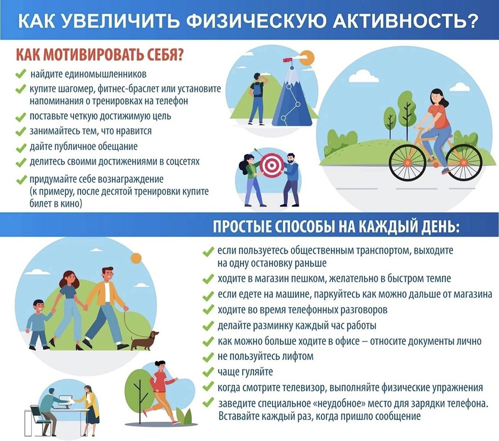 Физическая активность является неотъемлемым элементом сохранения здоровья человека в любом возрасте. Термин «физическая активность» относится к любым видам движений, в том числе во время отдыха и работы. К популярным видам физической активности относятся ходьба, езда на велосипеде, катание на коньках, занятия спортом, активный отдых и игры. Доказано, что регулярная физическая активность способствует профилактике и лечению неинфекционных заболеваний, таких как болезни сердца, инсульт, сахарный диабет и некоторых видов рака. Она также помогает поддерживать нормальный вес тела, заботиться о психическом здоровье, повышать качество жизни и благополучие.