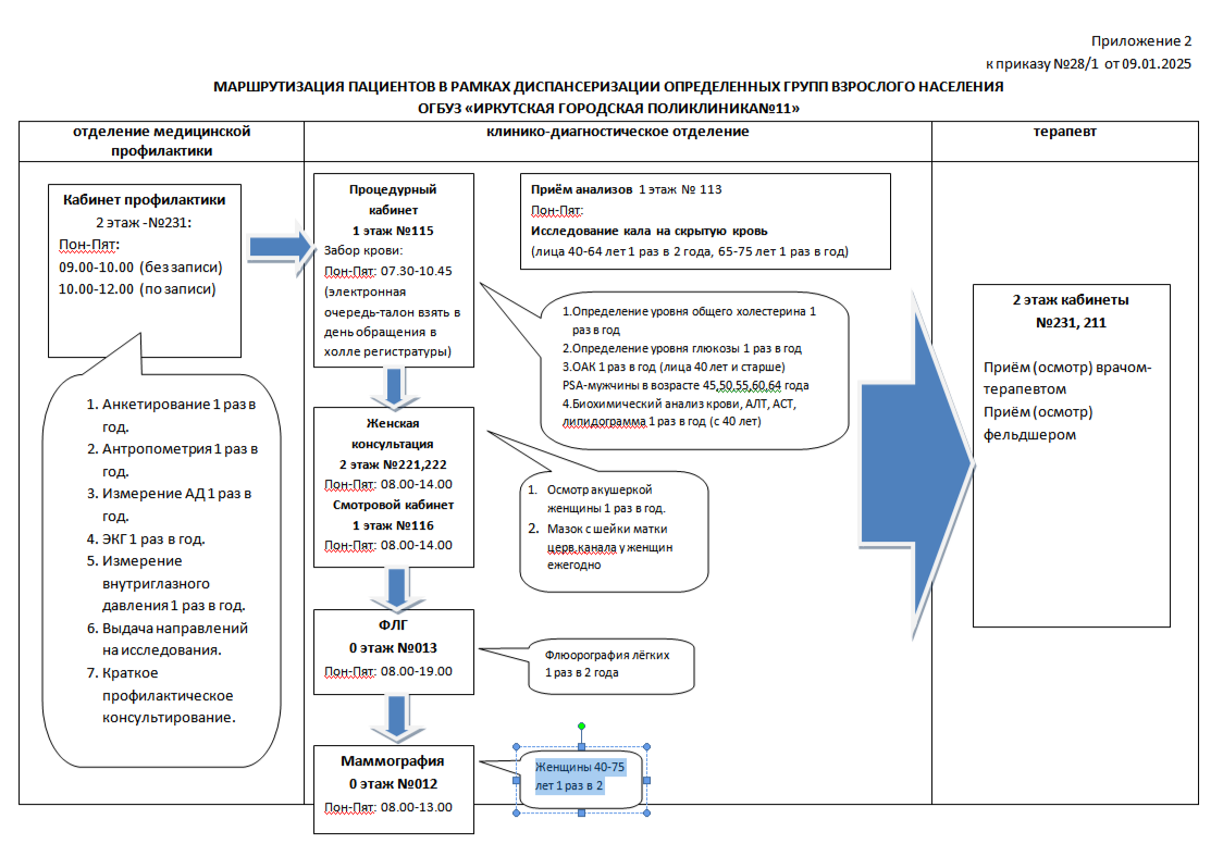 Подробный перечень исследований, проводимых для Вашего возраста, а также правила подготовки к ним, Вы можете узнать у вашего участкового терапевта.